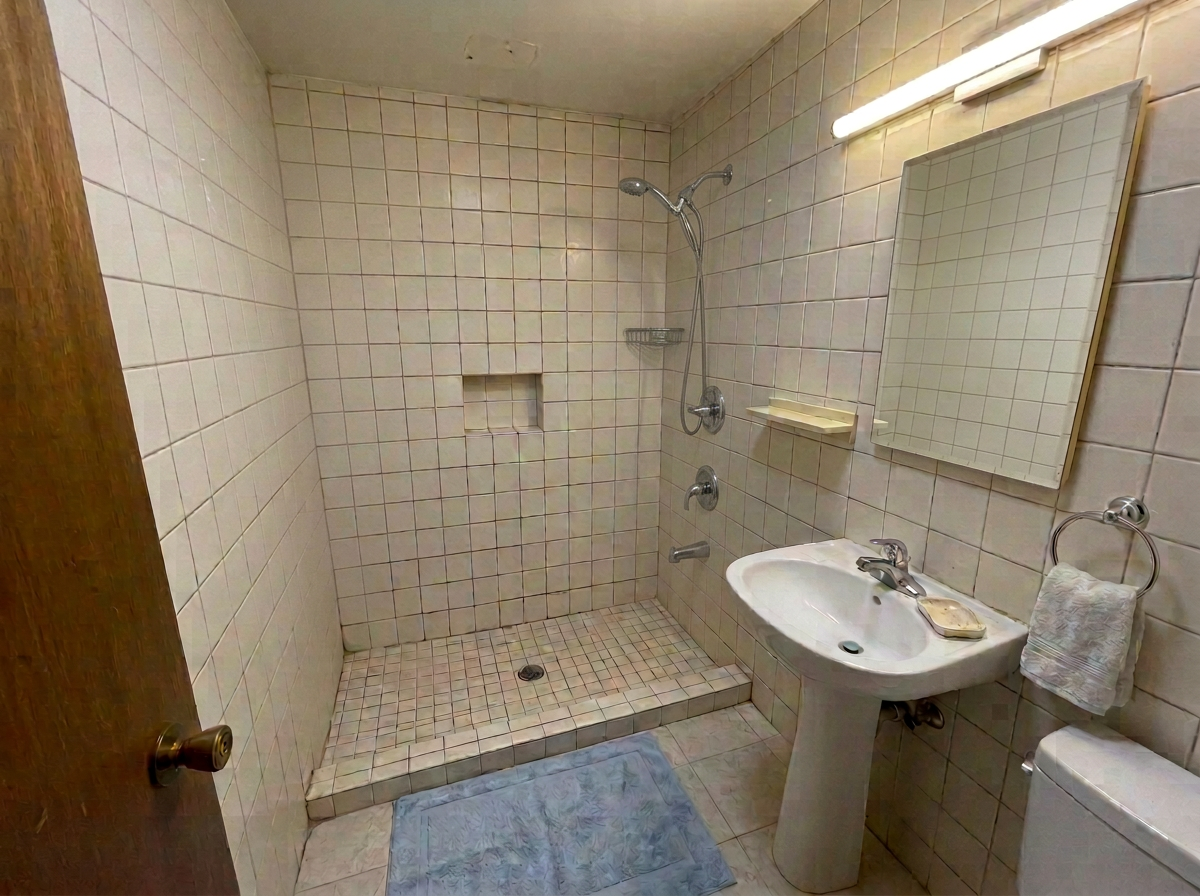 BeforeAfterFull bathroom retile — floor to ceiling