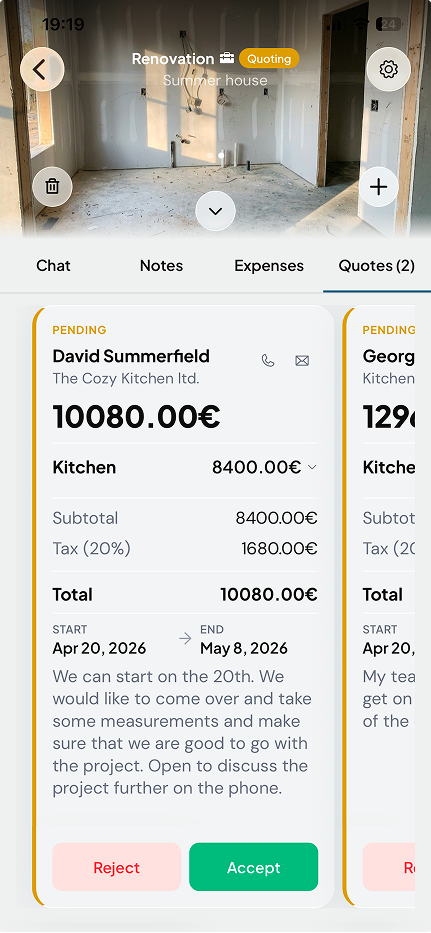 You saw the process. This is what it looks like when the quotes come in — each one structured, itemised, and signed with a start date. Every job has five views: photos, chat, notes, expenses, and quotes. Same record, every angle.